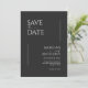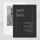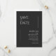Dessa 5 x 7-tumsdisketter för att spara datumkorten har en minimalistisk utformning i vit brev på en svart bakgrund med platshållare för det förlovade paret namn, bröllop datum och platsinformation. På baksidan finns en punkt där du kan infoga ditt favoritfoto med paret namn och bröllop.