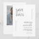 Dessa 5 x 7-tumskort för att spara datumkorten har en minimalistisk utformning i svart brev på vit bakgrund med platshållare för det förlovade paret namn, bröllop datum och platshållarinformation. På baksidan finns en punkt där du kan infoga ditt favoritfoto med paret namn och bröllop.