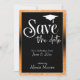 Med två utmärkande typsnitt har jag skapat grafik för ditt meddelande. Rubriken lyder "Spara datumet" och ovanför den är en bild som visar en studentmössa. All text placerades över en svart rektangel med kantlinjer som täcker över en ljus orange. Om du samordnar vita konfektyrer över den längst bakgrunden med ljusa färgader och en svartfärgad övertoningsbild som skapar ett sammanfogat resultat, slutförs effekten gräns. Ändra bakgrunden till färg till vad du vill! Studentmössan visas också på baksidan. >Plats för tabell>