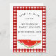 Planerar du en familjeåterförening? Låt familjen få veta datumet med det här unika Spara datumkortet. Det är dekorerat med vattenfärgsvattenmeloner och en röd och vit buffelbakgrund. Enkelt anpassade. Ursprunglig vattenfärg © Michele Davies.