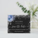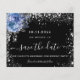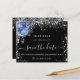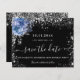 Ett giftigt och trendig Spara datumkortet för en 50:e (eller någon annan ålder) födelsedagsfest. En klassisk svart bakgrund som dekoreras med faux silver glitter damm och blåa blommor. Anpassa och lägg till datum och namn/ålder. Texten: Spara datumet skrivs med ett stort trendig-handskript i stil.