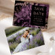 Den här eleganten har det moody bröllop spara datum-kortet en lush, romantisk blommigt bouquet i lila med faux foil i ro och glitter blad i svart bakgrund. Anpassa ro-färgad-texten i snyggt typsnitt på en svart rektangel och lägg till vågräts favoritbild på baksidan.