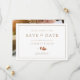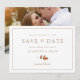 Höst | Höst löv Bröllop-fotot Spara datum. Den här eleganten och enkla bröllop spara datum har en vacker gren av vattenfärgad koppar och rost löv på vit bakgrund med gräns och text. I baksidan finns ett foto med förlovning för anpassning.
