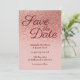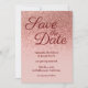 Bilden från ro faux glitter med en oskärpa i bokeh (vänd fotona om du vill) med en täckmantel för bröllop spara datum. Den dekorativa mörken röd burgundy "Spara datum" är ett elegant contemporary calligraphy stil. Namn och händelseinformationen visas i ett mer klassiskt teckensnitt stil. Övertoning av glam glitter vid rosa av ro och pastel. Faux glitter sparade datumen.