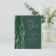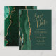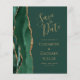 Det moderna bröllop spara datum-kortet från elegantens lämnat kant har en framväxande grönt vattenfärgsagat gräns som trimmas med faux guld glitter. Anpassadet kombinerar handskrift, rityta och kursivt typsnitt med guld-färgad mot gröntens bakgrund. Den omvända sidan har en matchande framväxande grönt och guld agate-design.