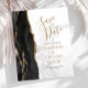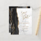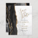 Det moderna bröllop spara datum-kortet från elegantens lämnat kant har en svart vattenfärgad agate gräns som trimmas med faux guld glitter. Med anpassadet kombineras handskrift, tryckplåt och kursivt typsnitt på grått- och vit marmorbakgrund med guld-färgad. Den omvända sidan har en matchande svartvit och guld agate-design.