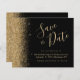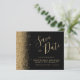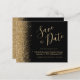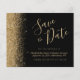 Den här eleganten sparar tidskortet gräns i guld faux glitter längs den lämnat kant. Anpassadet kombinerar guld-färgad-handskriftsskript, kopieringsskylt och kursivt typsnitt mot svart bakgrund. Den omvända sidan har en matchande design för svart och guld glitter.