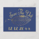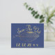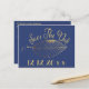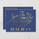 Elegant guld löv-grafik sparar vykortet för datum. Skicka ett meddelande till din familj och dina vänner för att spara datumet för bröllop, årsdagen, födelsedagen, pension eller andra party. Design har en blå bakgrund med guld-text.