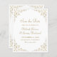 Den här vintage-inspirerade formella bröllop spara datum-kortet innehåller texten i guld färgad-skript och serif typsnitt, som är framtagen av ett känsligt vintage guld-motiv. Ram upprepas i motsatt riktning.