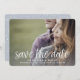 Ett modernt sätt att spara datumkortet designat för att passa ditt favoritfoto av vågrät eller den landskapsinriktade förlovningen med fullt. "Spara datumet" visas som ett överlägg längs grund med en vit handskriven text i stil, med texten namn, bröllop och bröllop under. Kort som går tillbaka till ett subtilt, prickat konetti mönster i grått och vitt.