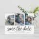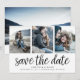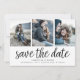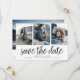 Ett modernt sätt att spara datumkortet designat för att rymma fyra av dina favoritfoton på förlovningen, med tre på framsidan och ytterligare ett utfallsfoto på baksidan av fullt. "Spara datumet" visas under fotona i en svart handskriven text i stil, med texten namn, bröllop datum och bröllop under. Lägg till webbplatsen bröllop i baksidan och en indikation på att en formell inbjudan kommer att följa.