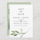 Den här inbjudan från bröllop spara datum innehåller en elegant vattenfärgsgrön löv och modern minimidesign. Det här datumet är perfekten som läggs till i din utomhusträdgård eller klassiska bröllop-händelse.