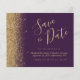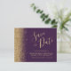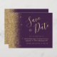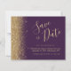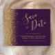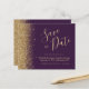 Den här eleganten sparar tidskortet gräns i guld faux glitter längs den lämnat kant. Anpassadet kombinerar guld-färgad-handskriftsskript, kopieringsskylt och kursivt typsnitt på mörkens lila-bakgrund. Den omvända sidan har en passande lila- och guld glitter-design.