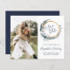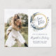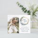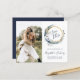 Den här boho sparar datumkortet med en bho-vattenfärgskrans av vita blommor, torkad löv och blå måne på ett guld-cirkulärt ram. Byt enkelt ut exempelbilden mot ett foto av er två. Anpassa handskriftsskriptet för marin elegant med namnen på briden och trimmen, och sans serif-texten med datum och plats. Den omvända sidan är en passande skugga av massivt marint blått.