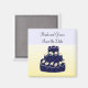 En söt blå bröllop-kaka med vita accenter och blommor med korallcentrum. På en mjuk gult. Anpassa med all information om bröllop efter behov.