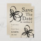Spara datumkortet med ett streck och svart färg-schema. Kortet har svarta blomillustrationer överst till lämnad och höger i grund. Anpassa den svarta texten med din information. Tan bakgrund.