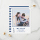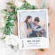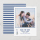 Ett modernt blått och vitt tema sparar datumet med ett gräns till ram på ditt speciella foto och ett av en vänlig hand plockade fyr. Baksidan har rand. Anpassningsalternativ är tillgängliga.
