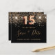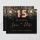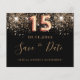 Ett girigt och trendig Spara datum för en Quinceañera, 15:e födelsedagsfesten. En svart bakgrund dekorerad med faux guld glitter. Mallar för datum och namn och text. Golden färgad brev. Texten: Spara datumet skrivs med ett stort trendig-handskript i stil.