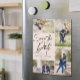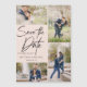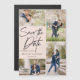 Ta din 5 bästa bilder från förlovningens fotosession med 4 för framsidan och en för baksidan. Den har en handskriftssymbol som säger Spara datumet.