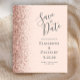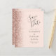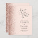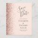 Det moderna bröllop spara datum-kortet från elegantens lämnat kant har ett faux glitter gräns i ro i guld. I anpassadet kombineras grått-handskrift med kol, kopparplåt och kursivt typsnitt på rosa. Den omvända sidan har en passande rosa och ro guld.