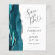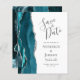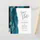Det moderna bröllop spara datum-kortet från elegantens lämnat kant har en tårblått vattenfärgsagat gräns som trimmas med faux silver glitter. Med anpassadet kombineras grått-handskrift, tryckplåt och kursivt typsnitt på vit bakgrund. Den omvända sidan har en passande teal och silver agate-design.