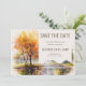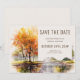 Fallbröllop spara datumkortet med scenisk vattenfärgsutformning i gröntens och färgens nyans. Den overksamma scenen har fallgropar och vackert träd med falllöv. Texten är redigerbar och om du vill matcha produkter bläddrar du i min Fall Sjö-samling.