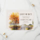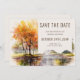 Fallbröllop spara datumkortet med scenisk vattenfärgsutformning i gröntens och färgens nyans. Den overksamma scenen har fallgropar och vackert träd med falllöv. Texten är redigerbar och om du vill matcha produkter bläddrar du i min Fall Sjö-samling.