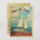 Den här vintagen nautisk termisk Connecticut Save Date har en segelbåt på vatten med fiskmås under flygning och ett vackert blått puffmoln himlar. Matchande bröllopsinbjudningar, RSVP och Infoga kort finns här (frasen kan klippas upp, kopieras till slutet av numret "...516"): https://www.zazzle.com/collections/119019904125157516
