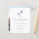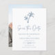 Detta budgetkort för bröllop spara datum har en enkel minimidesign av tropiska strandteman med två handflatan träd överst, i ett vitt och dammigt blått färg, med en fotomall på baksidan.