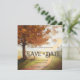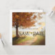 Spara datumet. Rustik som går väg genom en ängsskugga med fallande träd. Vattenfärgskonstruktion med gult, guld och orange.