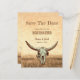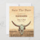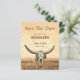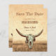 Budgeterad western vintage i land beige brun antika cowboybakgrund i stil. Platta kort i roligt bröllop spara datum. Rustiska inbjudningar av skallar från nötkreatur. Använda lite humor med den här söta, roliga bondgårdskonstruktionen. Typografi kan vara personlig. Gammal vilda western, unik. Coola, trendig husdjur. Anpassa skript och typografi. Upphovsrätt Marg Seregelyi Fotography.