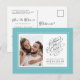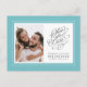 Lägg till ditt favoritförlovningsfoto och meddela det kommande bröllopsdatumet med vårt klassiska akvablå-gröna och vita "Spara datumet" bröllopsinbjudan i vykortformat! Designen har chic kalligrafi och typsnitt i kolgrått på en krävande vit bakgrund, placerad i en akvafärgad ram med en diskret vit kant. Anpassa bröllopsdesignen på framsidan med ditt foto, förnamn, plats och datum i kolgrå bokstäver och typsnitt. Baksidan på kortet matchar det vita med kolgrått typsnitt och har ytterligare detaljer, inklusive din returadress och webbplats eller annan anpassad text. För bästa resultat, beskär fotot med en fotoredigerare först och ersätt malltexten med dina detaljer, följ sedan instruktionerna i mallområdet. Om du behöver hjälp med detta eller någon av våra