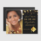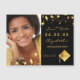 På framsidan: Lägg till ditt eget vertikala foto på studenten. En chic svart bakgrundsfärg, dekorerad med falska guldstjärnor. Anpassa och lägg till namn och datum. Guld bokstäver. Namnet och texten: Spara datum skrivs med en modern handskriven stilsnurr.