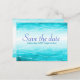 Spara datum bröllop gnistrande hav vykort målad i akvarell turkos blå havseffekt med en grafisk våg glans överlagd på en vit bakgrund. Original spara datum bröllopskort. Perfekt för ett strand, kust, nautiskt eller tropiskt destinationsbröllop. Del av den gnistrande hav bröllopssatsen. En elegant exklusiv design av Sarah Trett.