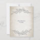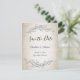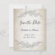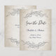 Ett Elegant bröllop sparar datumkortet designat med mjuk löv och svart skripttext. I texten på framsidan finns: Partikelns första Namn, datum och plats för Bröllop. Den omvända texten innehåller: Formell inbjudan att följa. Om du vill anpassa dig infogar du dina uppgifter i mallen och ersätter exemplet.