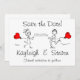 Det här toppen, moderna Spara datum meddelande, kommer säkert att få leenden från alla dina gäster! Med ett vektorritat par av tecknad stil som löper mot varandra med röda hjärtformade ballonger i händer. Toppen som är lätt att anpassa med din information!