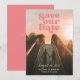 "spara our date" kan skalas, flyttat och färg ändras, men texten är inte redigerbar för själva bilden; valfri text på baksidan; anpassa ytterligare för att välja ditt eget bakersta färg och byta typsnitt på grund fram- och baksidan.