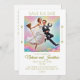 Rolig bild på ett nygift par som håller en sopkvast och en stekpanna och kastas i luften efter att ha hoppat glatt. En inbjudan att spara datumkort med en touch av humor.