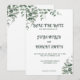 Ett vackert "Spara datum"-kort i en enkel elegant design dekorerad med Eukalyptusblad.