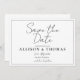 Tid utan stil, oförglömligt tillkännagivande. Den här enkla svartvitt-skript som sparar datumkortet har chic-handskriven typografi i stil på en skarp, minimal layout - perfekt för par som vill ha ett modernt, elegant sätt att tillkännage sin stora dag. Helt anpassade med namn, datum och plats. Den här designen är perfekt för formellt bröllop, minimalistiska teman eller svartvita affärer. Sofistikeringen var enkel.