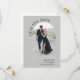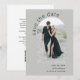 Den vackra enkelheten och den konstnärliga boho stil gör att det moderna bröllop spara datum-kortet blir attraktivt. Den har en ljusformad fotomall på kortets framsida för att överföra det önskade fotot. Det finns en textmall på kortets framsida som kan anpassas till bridens och gruppens namn och planerade datum i bröllop. På baksidan av detta kort finns ett exempelmeddelande med ytterligare information som kan anpassas, tillsammans med en QR-kodmall som skapar det enkelt för gästerna att visa bröllop webbplats. Det här kortet visas här med en bakgrund för ljussken grönt och finns även i andra färg.