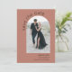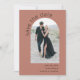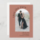 Den vackra enkelheten och den konstnärliga boho stil gör att det moderna bröllop spara datum-kortet blir attraktivt. Den har en ljusformad fotomall på kortets framsida för att överföra det önskade fotot. Det finns en textmall på kortets framsida som kan anpassas till bridens och gruppens namn och planerade datum i bröllop. På baksidan av detta kort finns ett exempelmeddelande med ytterligare information som kan anpassas, tillsammans med en QR-kodmall som skapar det enkelt för gästerna att visa bröllop webbplats. Det här kortet visas här med en jordisk terracotta-bakgrund och finns även i andra färg.