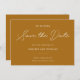 Den här eleganten Spara datumkortet har en design baserad på typografi. Ord Spara datumet visas på ett skript med stil-teckensnitt. Resten av händelseinformationen presenteras på ett rent och snyggt sätt. Detta minimalistkort är perfekt för vilken säsong som helst och det anger tonen för en modern men klassisk händelse.