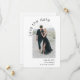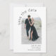 Den vackra enkelheten och den konstnärliga boho stil gör att det moderna bröllop spara datum-kortet blir attraktivt. Den har en ljusformad fotomall på kortets framsida för att överföra det önskade fotot. Det finns en textmall på kortets framsida som kan anpassas till bridens och gruppens namn och planerade datum i bröllop. På baksidan av detta kort finns ett exempelmeddelande med ytterligare information som kan anpassas, tillsammans med en QR-kodmall som skapar det enkelt för gästerna att visa bröllop webbplats. Det här kortet visas här med en vit bakgrund och finns även i andra färg.