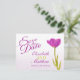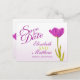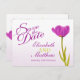Vacker ensam lila tulpan på grå rosa rustik färg spara datum bröllop informell inbjudan. Redigera denna inbjudan med dina egna ord. Enkel modern och romantisk inbjudan, perfekt för ett vår- eller tulpanblomsbröllop. Design och fin konst akvarell tulpanmålning av Sarah Trett.