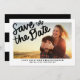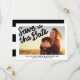 Whimsical och snyggt spara datum meddelande med foto med handskrivet papper sparar datumet i skript, elegant ram och ett strippat mönster tillbaka.