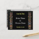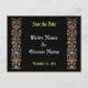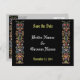 En anpassad Spara datum postkort med vacker gotisk, illuminerad manuskriptkonst med blommor och rullande blad på svart bakgrund och redigerbar text i svart bokstavsstil.