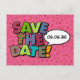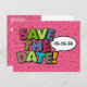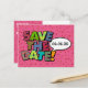 Med kärlekshjärta konfetti, ett roligt, coolt och trendigt serieinspirerat spara datum-kort som sätter wam, zap, pow i din bröllopsdatum annons. Baksidan visar din ytterligare evenemangsinformation. Designad av Thisisnotme