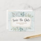Meddela bröllop med detta kort för söt och elegant. Rustiskt bladverk omfattar eukalyptus och komplementärt bladverk som målats i vattenfärg på en dammig blå bakgrund. I ett bågcentrum med lager framhävs dina detaljer på framsidan och baksidan. Enkel att anpassa med din personliga information.