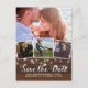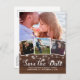 Rustik bröllop spara datum vykort med mörk träbakgrund, lampor, 4 bilder på det lyckliga paret och en modern mall för att spara datum som är lätt att anpassa.
